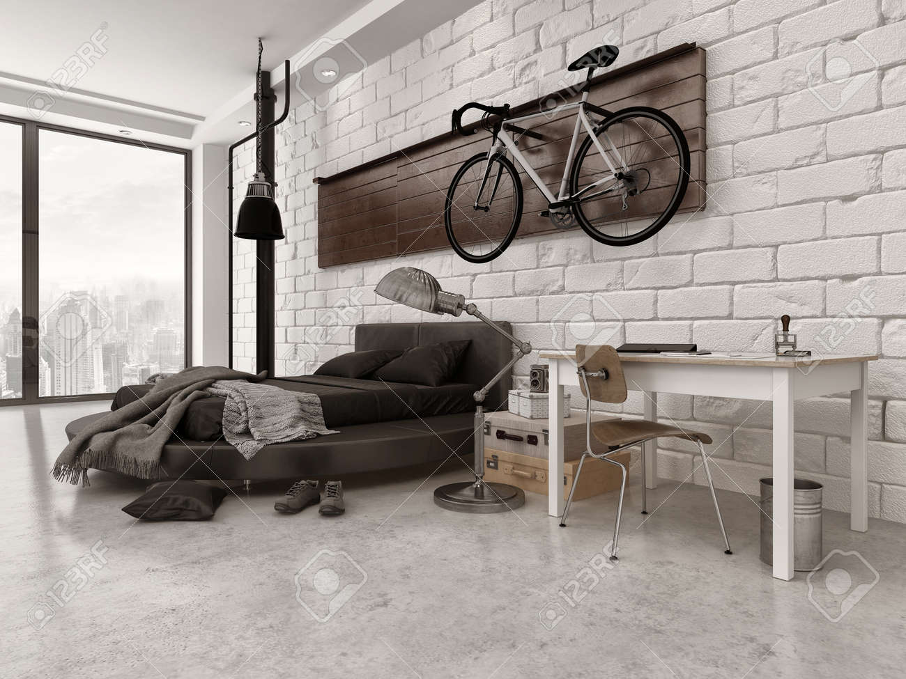 モダンなロフト スタイルのベッドルームのアパート 机 露出したレンガの壁に 自転車のハングアップ の写真素材 画像素材 Image